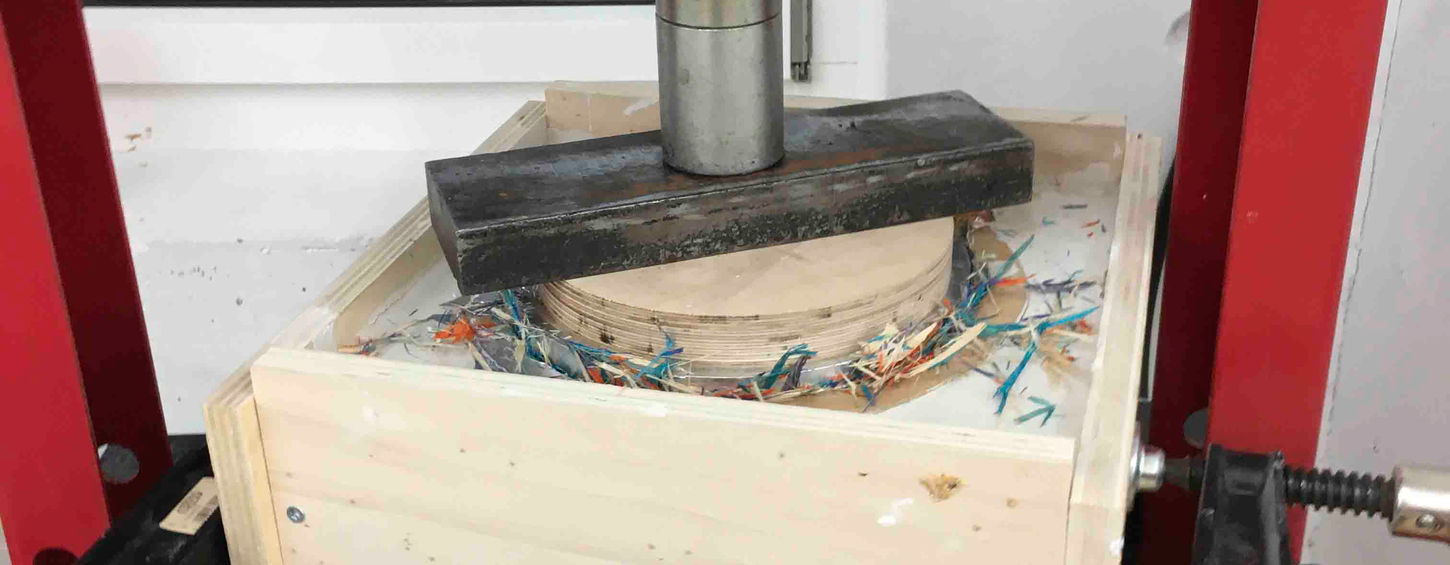 Skateboard furniture production, like most woodworking, creates shavings. The distinctive long shavings from the seven-layer colourful plywood can be pressed into new shapes using adhesive or proteins, high pressure and heat.